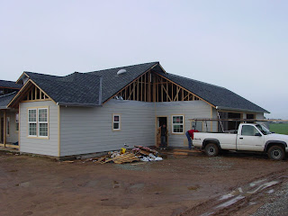 You can see in these two photos that they've been working on siding for the past few days and are getting close to being done. The siding on the front of the house is almost complete. All that's left is the areas under the roof eaves. The front of the garage is finished as well. My wife said that they were able to finish the area in the first picture today (she stopped by after work) - not sure about the areas in the front.